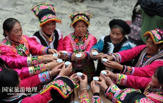 國家旅游地理 四川阿壩11月2日訊 11月2日,身著節(jié)日盛裝的四川省阿壩州汶川縣龍溪鄉(xiāng)村民們舉杯迎接羌歷新年的到來。當日,四川省阿壩州汶川縣龍溪鄉(xiāng)舉行傳統(tǒng)儀式迎接即將到來的羌歷新年。今年的11月3日農歷十月初一是羌歷新年,這是羌族一年中最為隆重的“慶豐收、送祝福、祈平安”的節(jié)日,按民間習俗,過羌年時要還愿敬神,全寨人歡聚一堂,吃團圓飯,共慶佳節(jié)。 /新華社發(fā)(何海洋 攝)