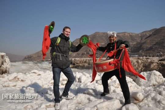 國家旅游地理 陜西延安1月26日訊 1月25日,一名游客在黃河壺口瀑布景區(qū)與民俗演員合影留念。當日,受凌汛影響一度關閉的黃河壺口瀑布景區(qū)重新開放迎賓,游客可近距離欣賞“冰瀑玉壺”的壯麗景觀。 /新華社發(fā)(呂桂明 攝)