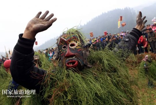 國家旅游地理 廣西柳州2月20日訊 2月16日,一名苗族青年戴著面具、披著芒草,扮成 “芒哥”跳舞。當日是農(nóng)歷正月十七,地處深山的廣西柳州市融水苗族自治縣安陲鄉(xiāng)在江門苗寨舉行傳統(tǒng)的“芒哥節(jié)”。眾多苗族男性青少年戴著面具、披著芒草、扮成“芒哥”起舞,為人們驅(qū)邪避禍,送去新春的祝福。據(jù)介紹,演“芒哥”是當?shù)孛缂胰霜毦咛厣男麓簜鹘y(tǒng)活動之一。 /新華社發(fā)(龍濤 攝)