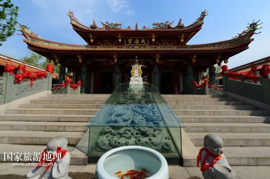 這是臺兒莊古城在原址復(fù)建的媽祖廟(4月7日攝)。作為京杭運(yùn)河上重要的水旱碼頭之一,臺兒莊的建筑融合了多種文化元素。