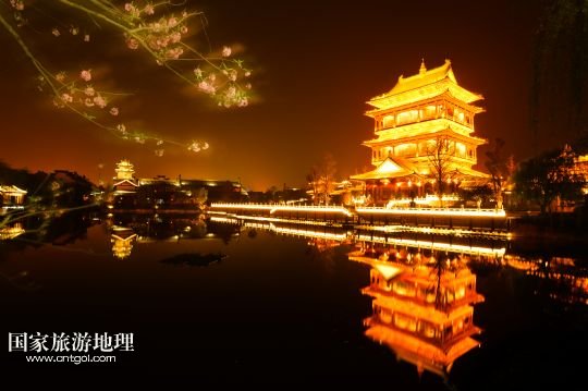 國家旅游地理 山東棗莊4月22日訊 這是夜色下的臺兒莊古城復(fù)興樓(4月8日攝)。1938年春的臺兒莊大戰(zhàn),是抗日戰(zhàn)爭爆發(fā)后中國軍隊(duì)在正面戰(zhàn)場取得的一次重大勝利。臺兒莊是世界著名的二戰(zhàn)紀(jì)念城市,有著2000多年歷史的臺兒莊古城完好地保存著53處戰(zhàn)爭遺跡。