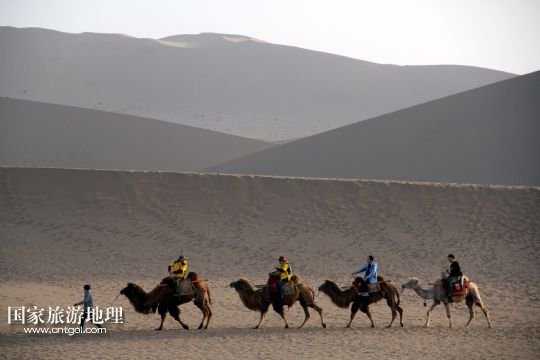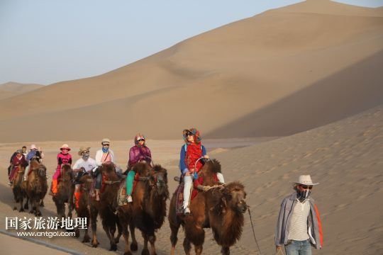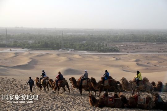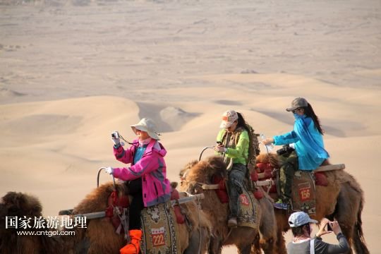 5月18日,游客乘駱駝在甘肅省敦煌市鳴沙山月牙泉景區(qū)欣賞大漠風(fēng)光。