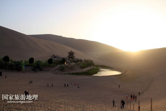 國家旅游地理 甘肅酒泉5月19日訊 夕陽下的甘肅省敦煌市鳴沙山月牙泉顯得更加迷人(5月18日攝)。初夏時節(jié),甘肅省敦煌市鳴沙山月牙泉景區(qū)風(fēng)光秀美,吸引眾多中外游客前來觀光游覽。 新華社發(fā)(張曉亮 攝)