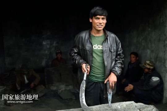 7月17日,巴桑次仁在達(dá)曼村的鐵匠鋪內(nèi)展示制作的農(nóng)具。