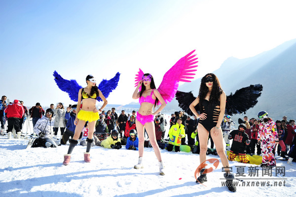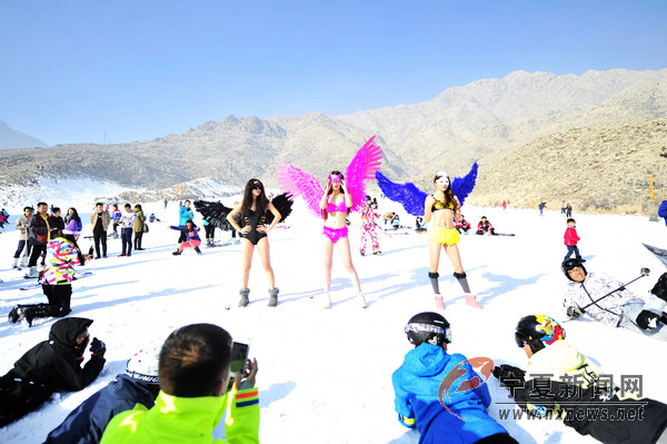 2016年1月1日,新年第一天,在銀川蘇峪口國家森林公園滑雪場,幾位身著色彩艷麗比基尼美女在雪中秀身材并展示瑜伽技巧,吸引了眾多滑雪愛好者的目光。當(dāng)日,蘇峪口滑雪場前來滑雪的人達數(shù)千人。 寧夏新聞網(wǎng)記者 祁瀛濤 攝